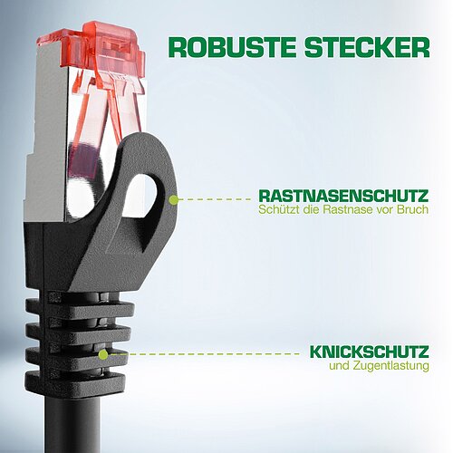 - Stecker: 2 × RJ45-Stecker, vergossen, mit Rastnasenschutz