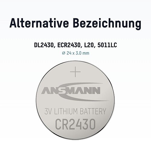 Die Ansmann CR2430 ist eine hochwertige Lithium-Knopfzelle mit 3,0 V Spannung und 270 mAh Kapazität. Sie eignet sich ideal für eine Vielzahl von Geräten - von Uhren, Taschenrechnern und Waagen bis hin zu Autoschlüsseln, Digitalkameras oder Garagentoröffnern.