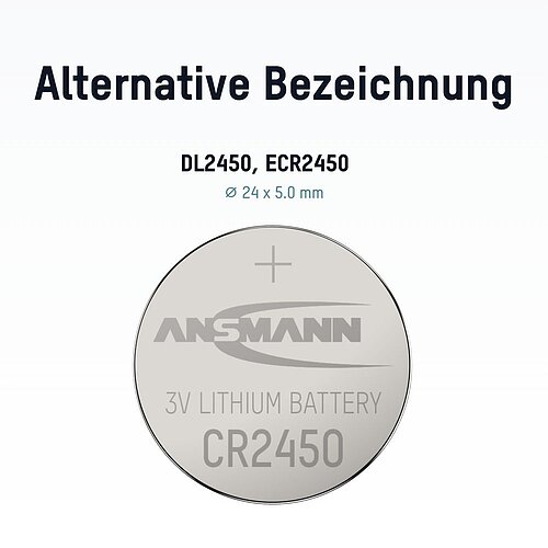 Die Ansmann CR2450 ist eine hochwertige Lithium-Knopfzelle mit 3,0 V Spannung und 620 mAh Kapazität - ideal für eine Vielzahl von Geräten des Alltags. Sie kommt unter anderem in Taschenrechnern, Waagen, Uhren, Autoschlüsseln, Digitalkameras oder Garagentoröffnern zum Einsatz.