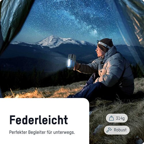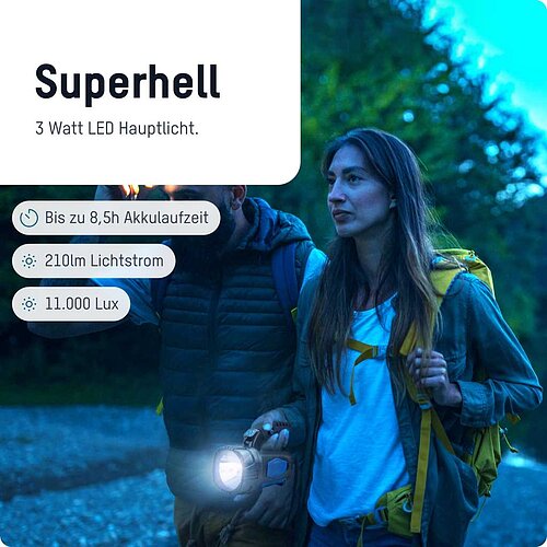 - Arbeitslicht: COB LED mit großflächigem, homogenem Licht (210 Lumen)