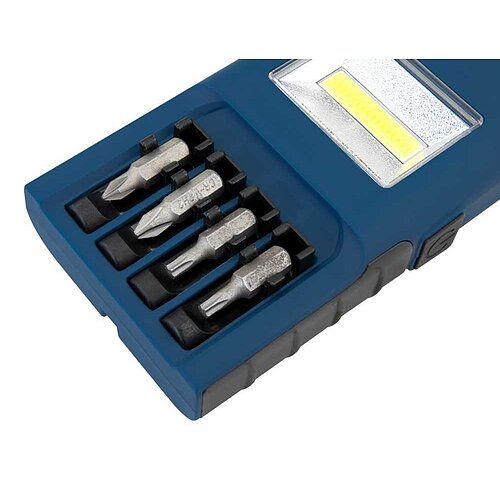 Werkstattleuchte mit Bithalterung? Bithalter mit Leuchtfunktion? Die WL180B hat im Lieferumfang die meistgebräuchlichen Bits integriert. Zu finden sind die Bits TX15, TX20, PH1 sowie PH2. Somit ist die Leuchte auch die perfekte Ergänzung zu Ihrem Werkzeugkasten. Um eine einfache und schnelle Bedienung zu gewährleisten, wurde bei der Konzeption auf einen großen Funktionsschalter gesetzt, mit welchem man zwischen den Funktionen 50% und 100% wechseln kann und somit ausreichend Licht für diverse Anwendungen zur Verfügung hat.