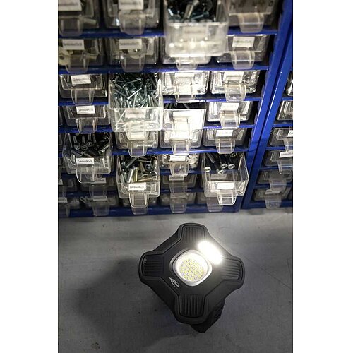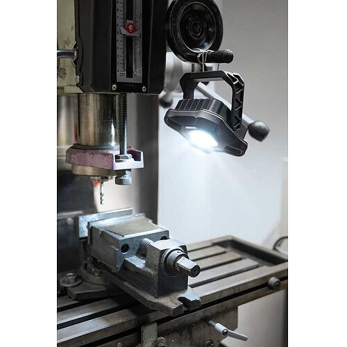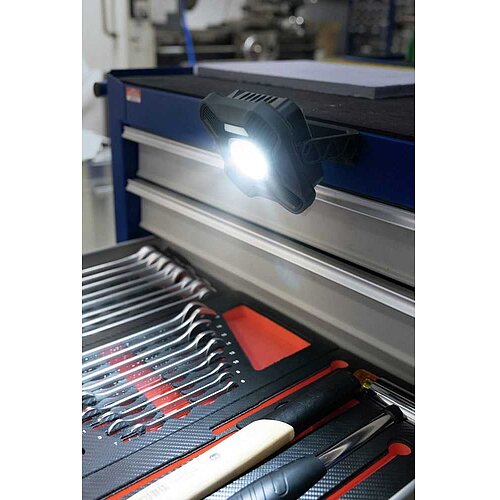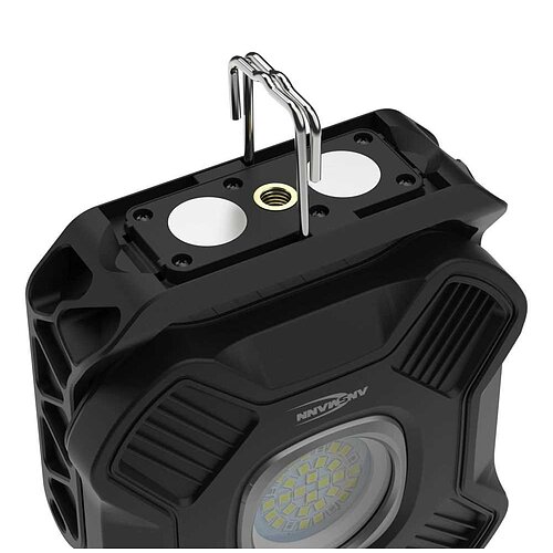 Das robuste Gehäuse ist ergonomisch geformt. Die gummierten Griffflächen sorgen für den nötigen Gripp bei anspruchsvolle Arbeiten. Mit vielen praktischen Kniffen ist die ML3000RD ein absolutes Multitalent, ideal fu?r vielseitige Anwender. So verfügt sie über zwei um 180° schwenkbare und um 360° drehbare Halterungen für die flexible Lichtausrichtung. Zwei Haltemagnete in den Halterungen dienen der Fixierung und Ausrichtung der Leuchte an metallischen Gegenständen. Zwei herausklappbare, um 360° drehbare Haken auf der Gehäuserückseite bieten zusätzliche Befestigungsmöglichkeiten. Dadurch bleiben beide Hände frei für Ihre Arbeit in der Werkstatt, auf Baustellen oder bei Montagearbeiten.