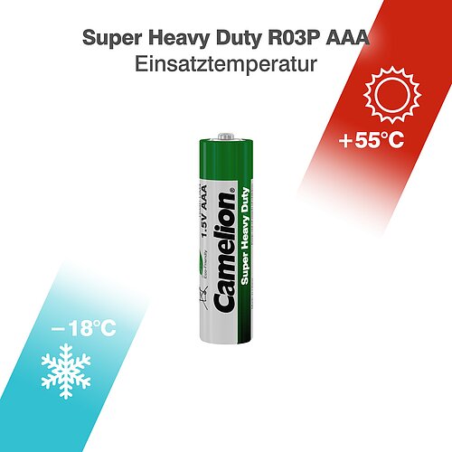 Die Camelion Super Heavy Duty AA Batterien sind kostengünstige Zink-Kohle-Batterien, die für Geräte mit niedrigem Energiebedarf entwickelt wurden. Sie bieten 960 mAh Leistung und sind ideal für Fernbedienungen, Wanduhren und einfache Taschenlampen. Geliefert werden sie lose. Für Anwendungen mit höherem Energieverbrauch sollten Alkaline-Batterien verwendet werden.