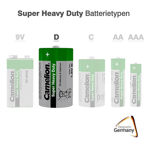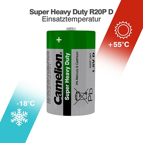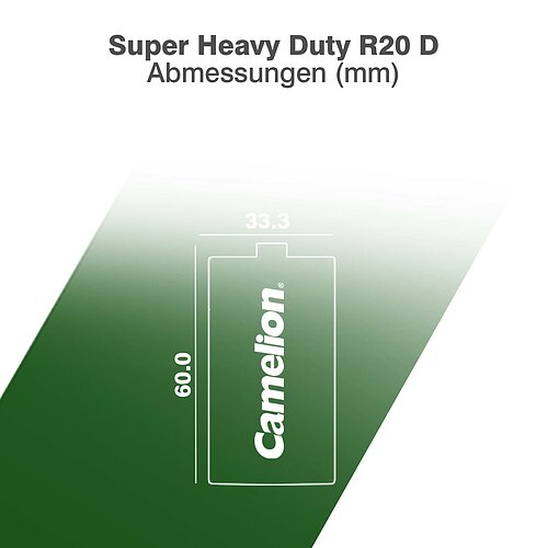 Die Camelion Super Heavy Duty Mono D Batterien 1,5V 5600mAh sind robuste und kostengünstige Zink-Kohle-Batterien, die für einfache Anwendungen und Geräte mit geringem Energiebedarf entwickelt wurden. Sie eignen sich ideal für Wanduhren, Wecker und Taschenlampen. Geliefert werden sie in einer praktischen 2er Folienverpackung. Bitte beachten Sie, dass diese Batterien nicht für energieintensive Anwendungen wie LED-Beleuchtung, Kinderspielzeug oder Rauchmelder geeignet sind. Für diese empfehlen sich leistungsstärkere Alkaline Batterien.