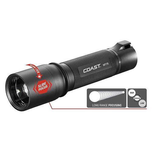 Die COAST HP7R Tactical LED-Taschenlampe mit Dual Power hat eine Leuchtweite von bis zu 354 Metern*. Mit ihren 3 Leuchtmodi - High, Stroboskop und Low, ist sie ideal für alle Profis im Sicherheits- und Rettungsdienst, sowie für die Jagd und das Militär. Der zweite mitgelieferte Akku kann separat geladen werden, so dass die Lampe immer einsatzbereit ist. Im Extremfall gibt es noch ein Batteriefach für die Aufnahme von 4 x AAA Alkaline Batterien, was ebenfalls im Lieferumfang enthalten ist. Der ?Quick-Cycle-Switch? erlaubt über mehrmaliges kurzes Drücken die Wahl zwischen einer hohen Lichtleistung von 205 Lumen*, einem starken Stroboskoplicht oder gedimmten 22 Lumen* Lichtleistung. Mit dem ?Slide-Focus? kann man einhändig sehr schnell von einem großen Lichtkreis zum ?X-Range-Spot? wechseln. Das leichte Aluminiumgehäuse ist auf Langlebigkeit und Robustheit ausgelegt. Die Lampe ist mit einem Wegrollschutz ausgestattet.