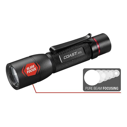 Die COAST HX5 fokussierbare LED-Taschenlampe ist der Kraftprotz unter den kompakten Taschenlampen. Die COAST HX5 kann mit verschiedenen Energiequellen betrieben werden: 1x AA Alkaline (130 Lumen*), Ni-MH AA Akku (125 Lumen*) oder mit einem Li-Ion 14500 Akku (345 Lumen*). Neben der guten Ergonomie durch die kurze Bauweise mit ?Slide Focus Control? und dem rückseitigen Ein-/Ausschalter kann man alle Funktionen einhändig ausführen, auch mit Handschuhen. Als außerordentlich praktisch erweist sich auch der Clip, mit dem die Lampe in zwei Richtungen fixiert werden kann. Zum Beispiel am Ärmel einer Jacke, so bleiben die Hände frei. Die Umstellung vom großen Leuchtkreis zum ?Bulls-Eye Spot Beam? erfolgt über einfaches Schieben des Lampenkopfes.