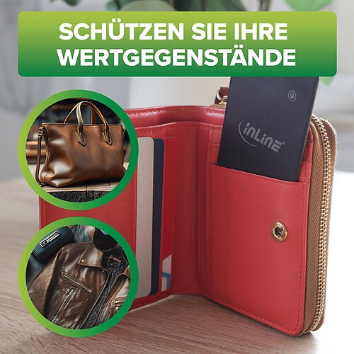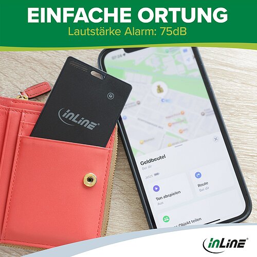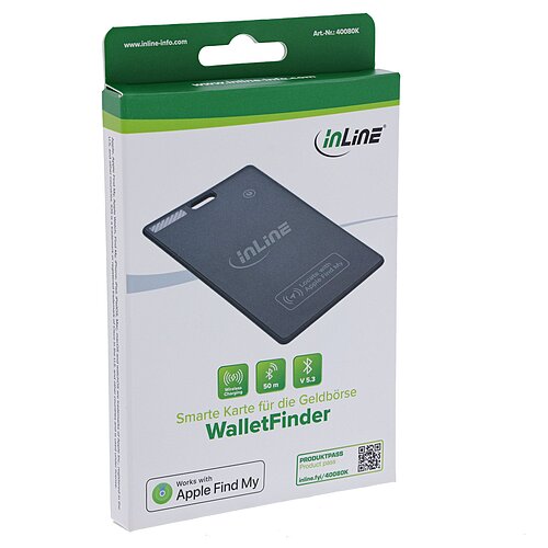 Der InLine® Wallet Finder ist ein smarter Bluetooth-Tracker im Kreditkartenformat mit Apple ?Wo ist-Integration. Ideal für Geldbörsen, Laptoptaschen, Firmenwagen oder Reisekoffer - so behalten Sie Ihre Wertgegenstände jederzeit im Blick. Mit Qi-Ladefunktion, bis zu 10 Monaten Standby-Zeit und IPX5-Schutz ist der Wallet Finder perfekt für geschäftliche und private Einsätze.