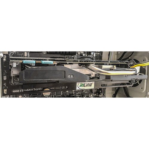 Die InLine® Halterung für Grafikkarten sorgt für eine stabile Fixierung schwerer GPUs und schützt so das Mainboard vor mechanischer Belastung. Sie wird einfach auf die Slotblenden des ATX-Gehäuses geschraubt und bietet mit ihren Langlöchern eine flexible Ausrichtung - ideal für Gaming-PCs oder Systeme mit großen Grafikkarten.