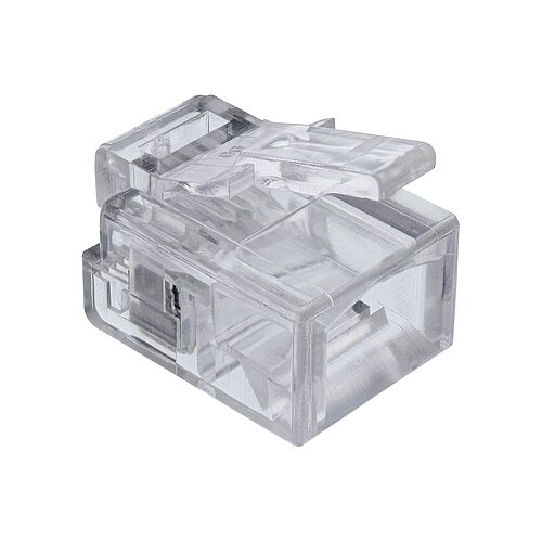 Der RJ11 Modularstecker ist speziell für die Konfektionierung von Rundkabeln konzipiert. Er besitzt eine 6P4C-Belegung, wobei nur die inneren 4 Kontakte (Pins 2, 3, 4 und 5) belegt sind. Dieser Stecker wird häufig für analoge Telefoninstallationen verwendet und ermöglicht eine zuverlässige Signalübertragung.