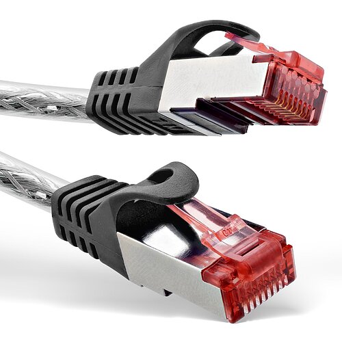 langes transparentes Cat.6 S/FTP (PiMf) Patchkabel mit beidseitig vergossenen RJ45-Steckern für zuverlässige Gigabit-Verbindungen bis 1 Gbit/s bei Frequenzen bis 250 MHz. Die hochwertige S/FTP-Doppelschirmung (Geflecht- und Folienabschirmung pro Aderpaar) sorgt für optimalen Schutz vor elektromagnetischen Störeinflüssen. Mit AWG27-Kupferlitzen, PVC-Mantel und angespritztem Rastnasenschutz bietet das Kabel hervorragende Signalqualität und lange Lebensdauer ? ideal für professionelle Netzwerkumgebungen.
