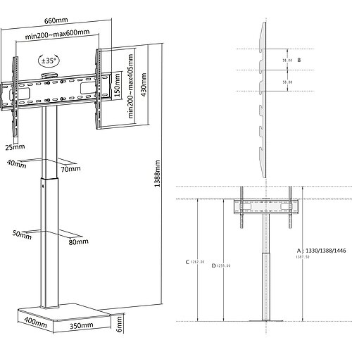 Bitte beachten Sie: Bei dieser Halterung ist die Höhe lediglich in 3 Positionen um +/-58mm an der Quertraverse der TV-Halterung einstellbar, die 2-teilige Tragesäule selbst ist fixiert und nicht in der Höhe einstellbar. Weitere Details entnehmen Sie bitte der Zeichnung.