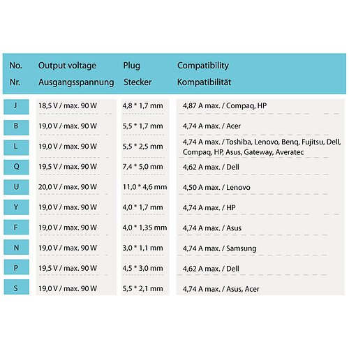 | Stecker | J - 18,5 V / 4,8�1,7 mm - Compaq, HP B - 19 V / 5,5�1,7 mm - Acer L - 19 V / 5,5�2,5 mm - Toshiba, Lenovo, BenQ, Fujitsu, Dell, Compaq, HP, Asus, Gateway, Averatec Q - 19,5 V / 7,4�5,0 mm - Dell U - 20 V / 11,0°4,6 mm - Lenovo Y - 19 V / 4,0°1,7 mm - HP F - 19 V / 4,0°1,35 mm - Asus N - 19 V / 3,0°1,1 mm - Samsung P - 19,5 V / 4,5�3,0 mm - Dell S - 19 V / 5,5�2,1 mm - Asus, Acer |