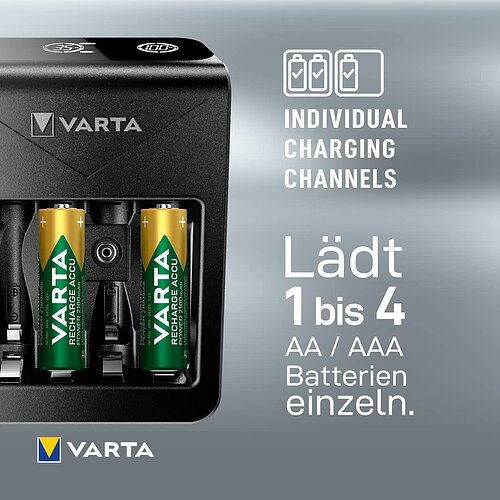| Mit dem Varta LCD+ Plug 57687 Ladegerät können Sie bequem und sicher AA Mignon, AAA Micro, 9V Blöcke Nickel-Metallhydrid Akkus und ein externes USB Gerät aufladen. Das Ladegerät bietet eine Einzelschachtladung für höchste Flexibilität und beste Ladeergebnisse und verfügt über eine Minus Delta U-Abschaltung, Zeitabschaltung, Kurzschlussschutz sowie eine Erkennung von alkalischen und defekten Zellen. Mit seinen einfachen und großen LCD-Anzeige ist das Ladegerät besonders komfortabel zu bedienen. Außerdem werden 4 AA Mignon Akkus mit 2100mAh mitgeliefert, damit sie sofort loslegen können. | |