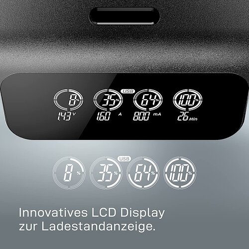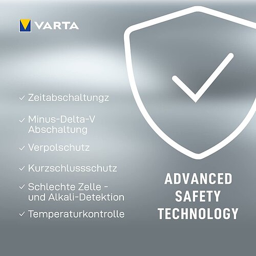 | Sicherheitsmerkmale | - Timer-Abschaltung - Minus-Delta-V-Abschaltung - Erkennung schlechter Zellen und Alkali-Batterien - Schutz vor falscher Polarität - Kurzschlussschutz - Erhaltungsladung - LCD-Anzeige für mehr Komfort - Displayanzeige: V, mAh und Minuten - Einzelschachtladung |