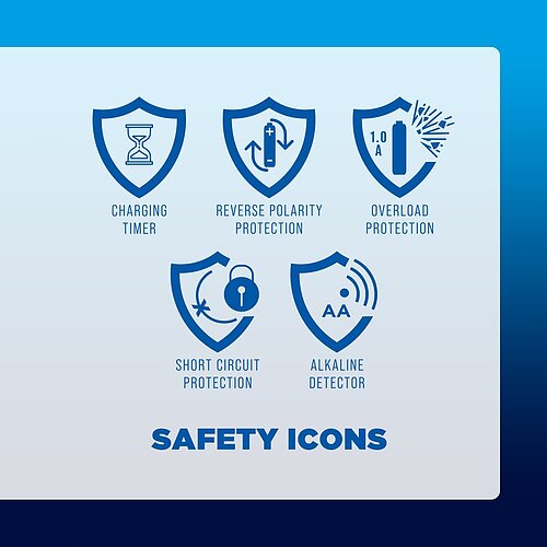 | Sicherheitsmerkmale | - Akku-Defekt Erkennung - Einzelschachtüberwachung - Minus-Delta-U Abschaltung - Temperaturüberwachung - Timer-Abschaltung - LED Anzeige für Ladestand |