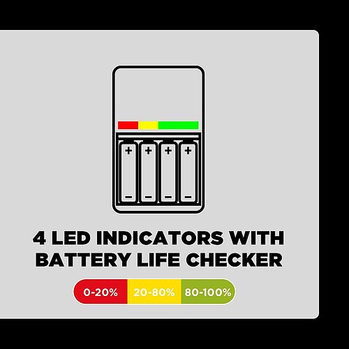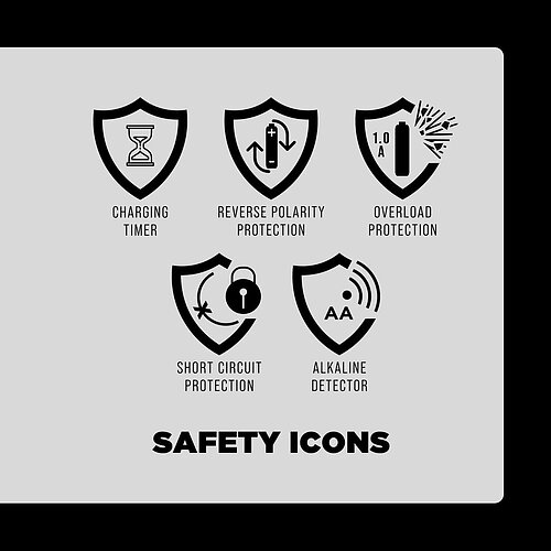 | Sicherheitsmerkmale | - Akku-Defekt Erkennung - Einzelschachtüberwachung - Minus-Delta-U Abschaltung - Temperaturüberwachung - Timer-Abschaltung - LED Anzeige für Ladestand |