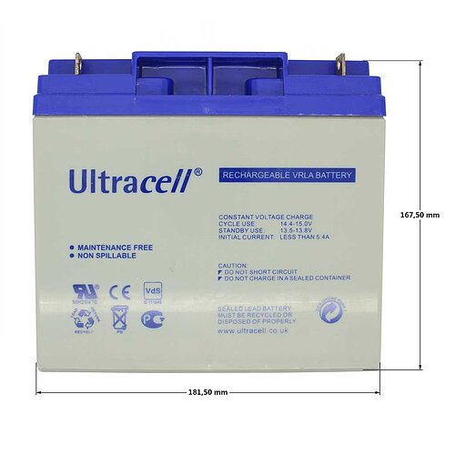 nAbmessungen: 182 x 77 x 168 mm (LxBxH) / Anschlüsse: M6 / Anwendung: Zyklenfest / chemisches System: Gel / Design Life: 10 - 12 Jahre / Gewicht: 6 kg / Kapazität: 20 Ah / Spannung: 12 V